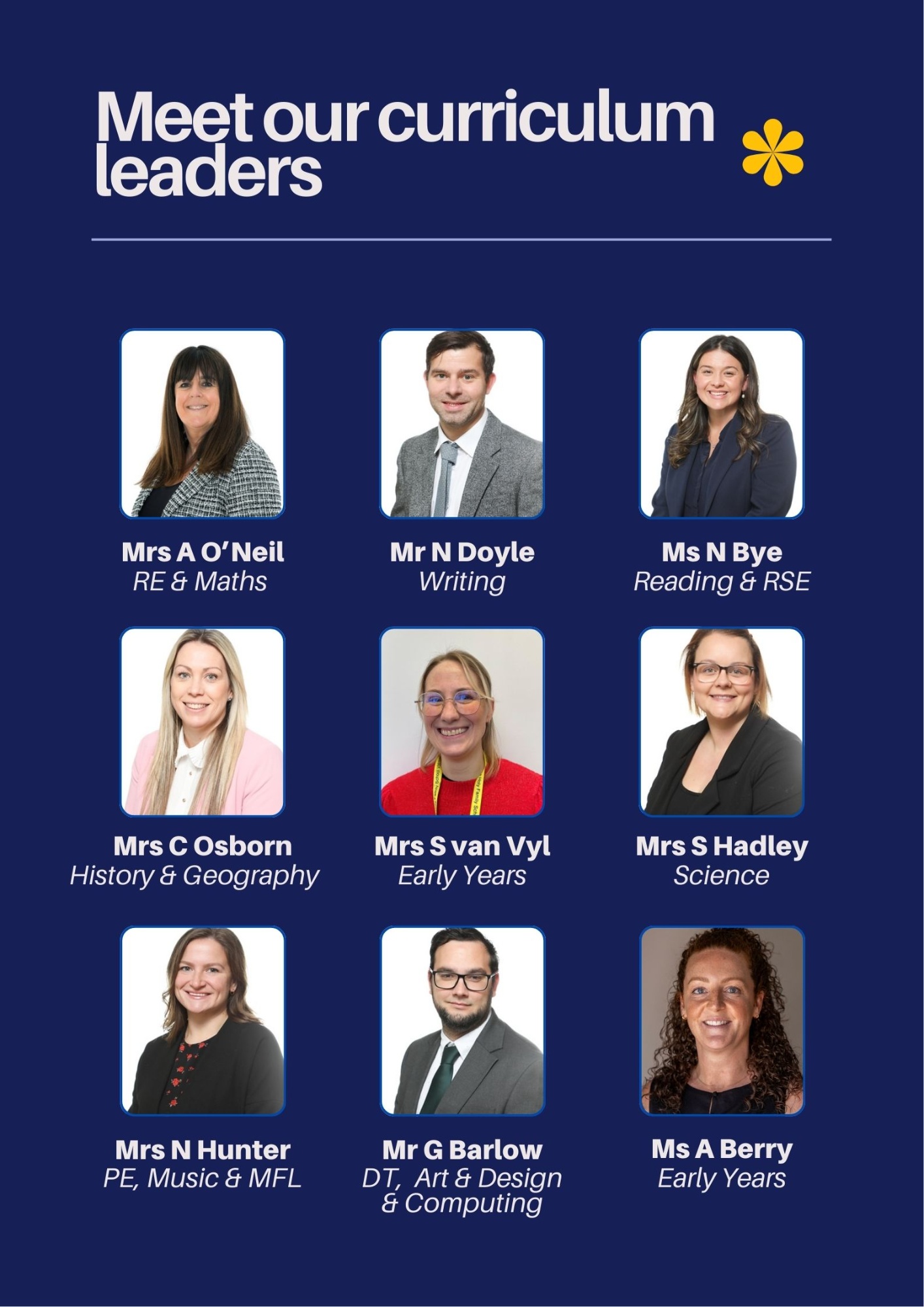 All of the team members at Holy Family are committed to delivering an exceptional curriculum for our children. In addition, we have a team of subject leaders who are responsible for guiding, delivering, and implementing this outstanding curriculum.