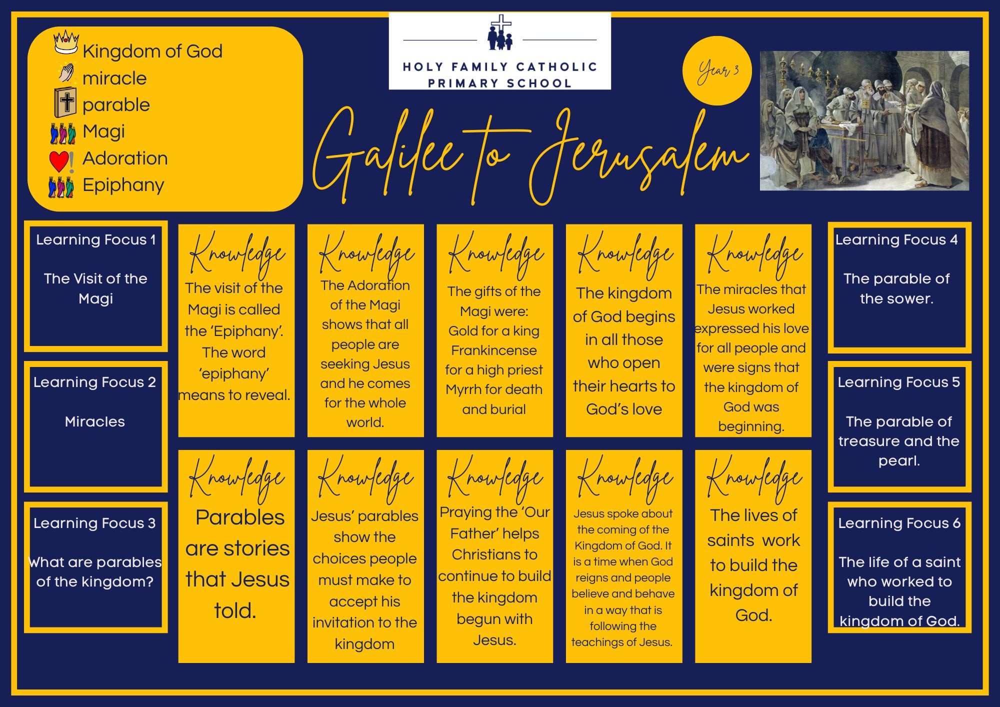 Year 3 will also encounter different literary forms as they study parables and study the Gospel of St Matthew and learn about the signs of God’s kingdom in this gospel. They will be introduced to the mystery of Trinity. They will learn about how Jewish families celebrate the Passover today and some simple facts about Islam.