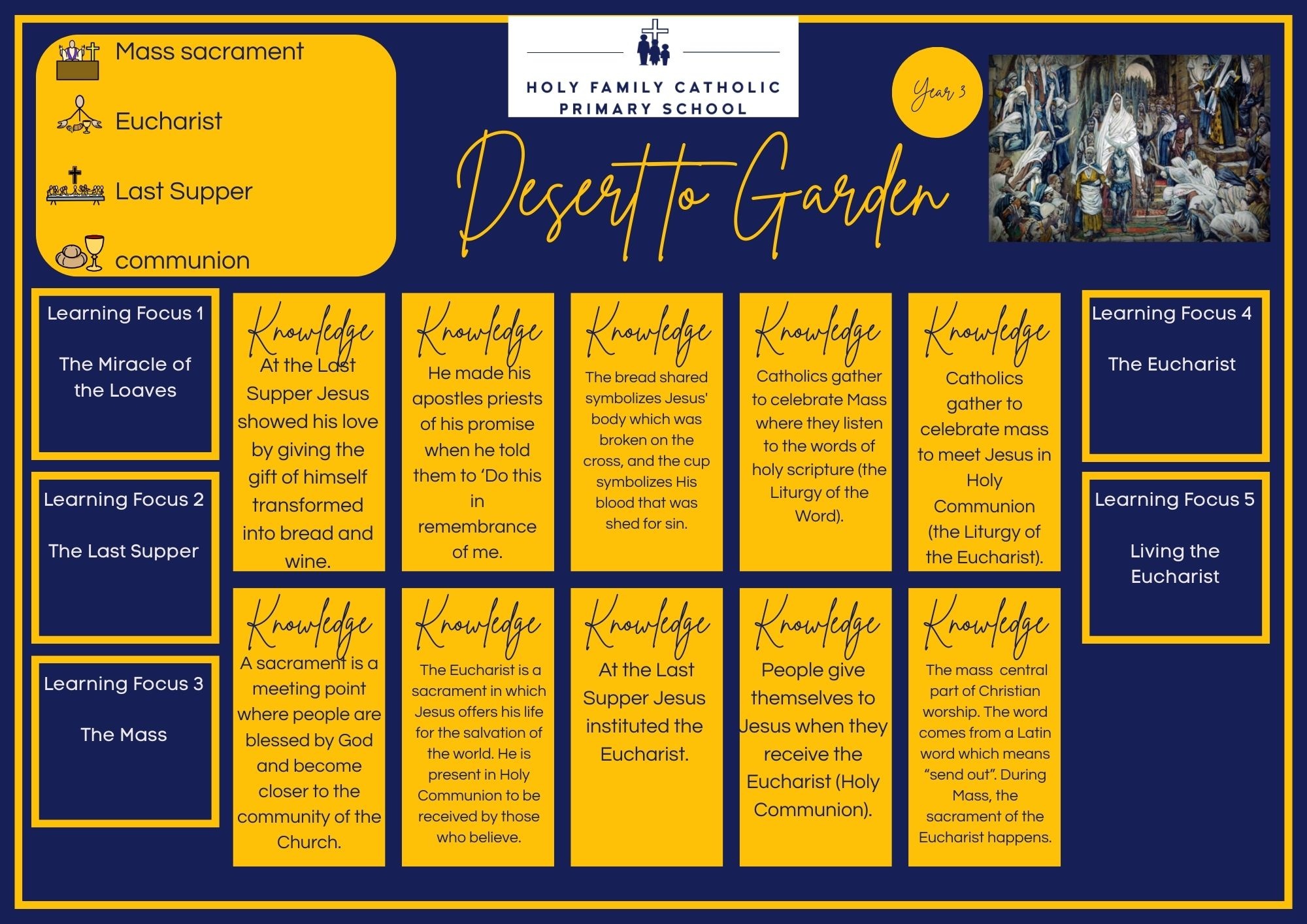 In the first branch the story of Creation, humanity, made in the image and likeness of God, is given the task of caring for the Earth, stewardship. At Mass, Catholics give thanks for the fruits of the Earth at the Offertory. In branches two and three, pupils will learn about what happens at Mass, making links with scripture, for example, the feeding of the five thousand and Jesus’ last supper.