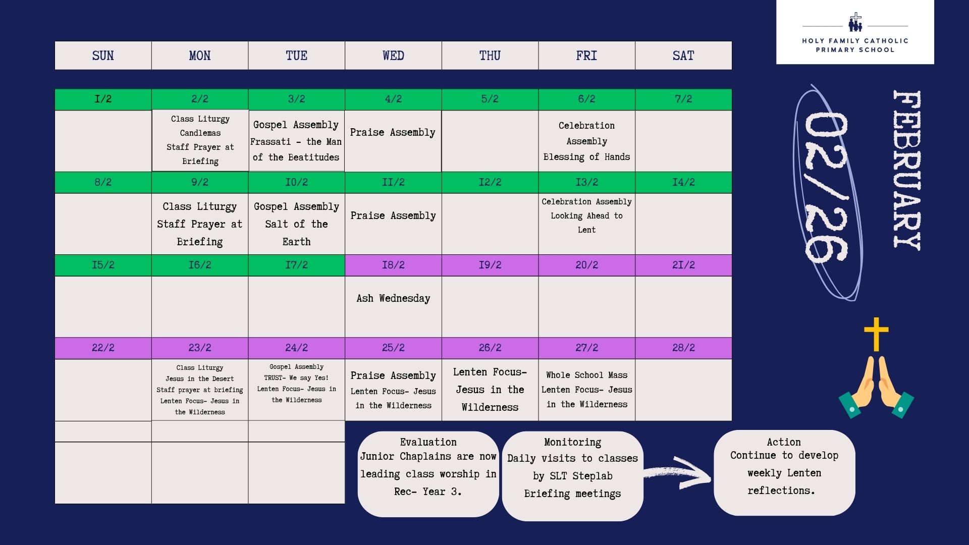 Holy Family's Annual Plan of Provision (APoP) is a year-long strategy that outlines how we will bring our Catholic life and mission to life through various activities, including Religious Education (RE), prayer, liturgy, school Masses, retreats, and sacramental preparation. It ensures that our Catholic ethos is integrated into all aspects of our daily life and is tailored to the spiritual needs of all our children.