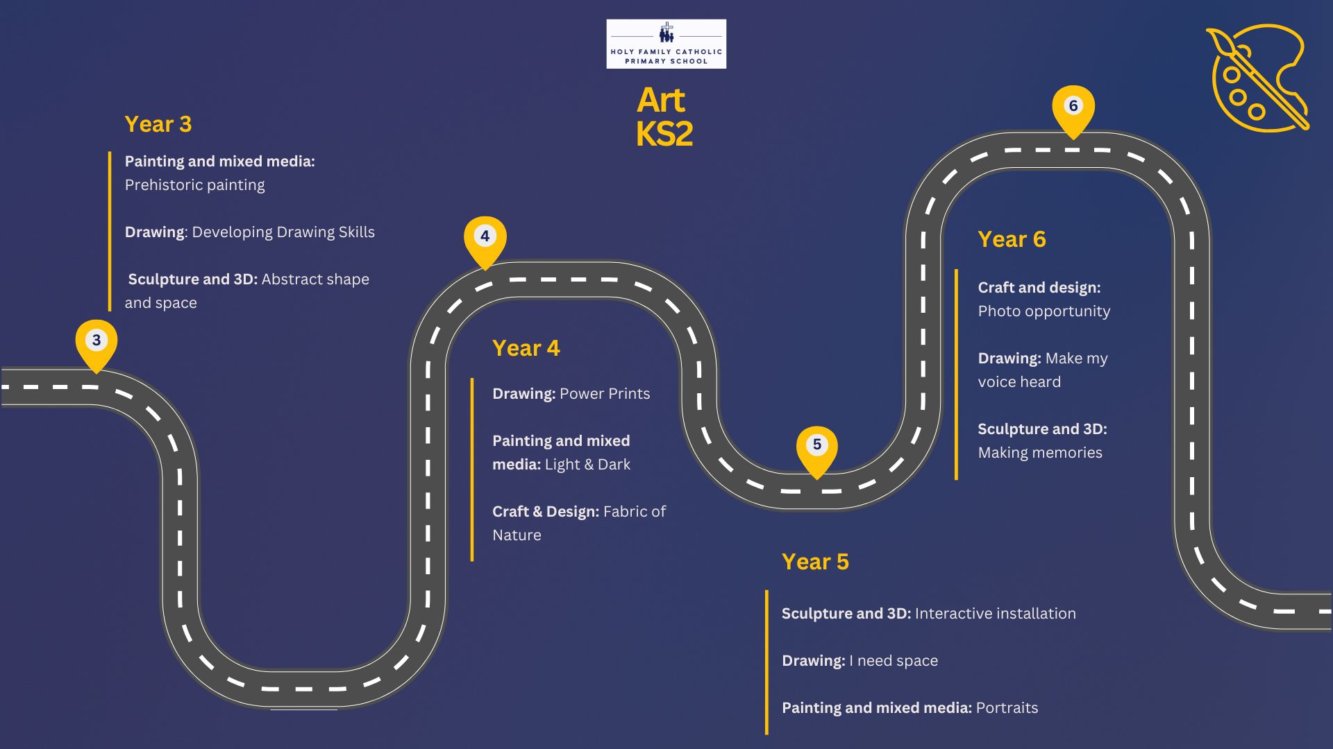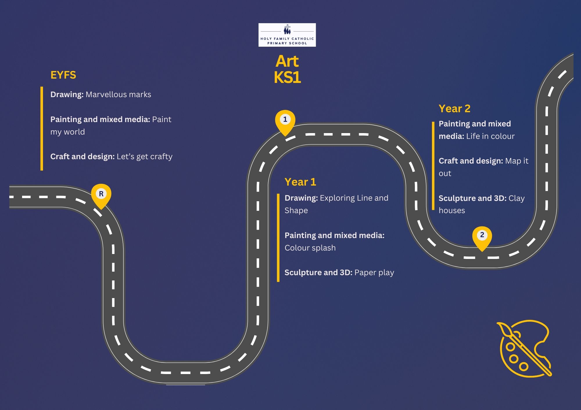 At Holy Family our primary intent in teaching Art is to develop children’s confidence in experimenting with their imagination and creativity. Children study and learn to appreciate a range of media and artists and have numerous opportunities for their own creative response. Our curriculum enables children to develop their artistic skills progressively, throughout their time with us, and units of work are designed to build on children’s prior knowledge and skills.
