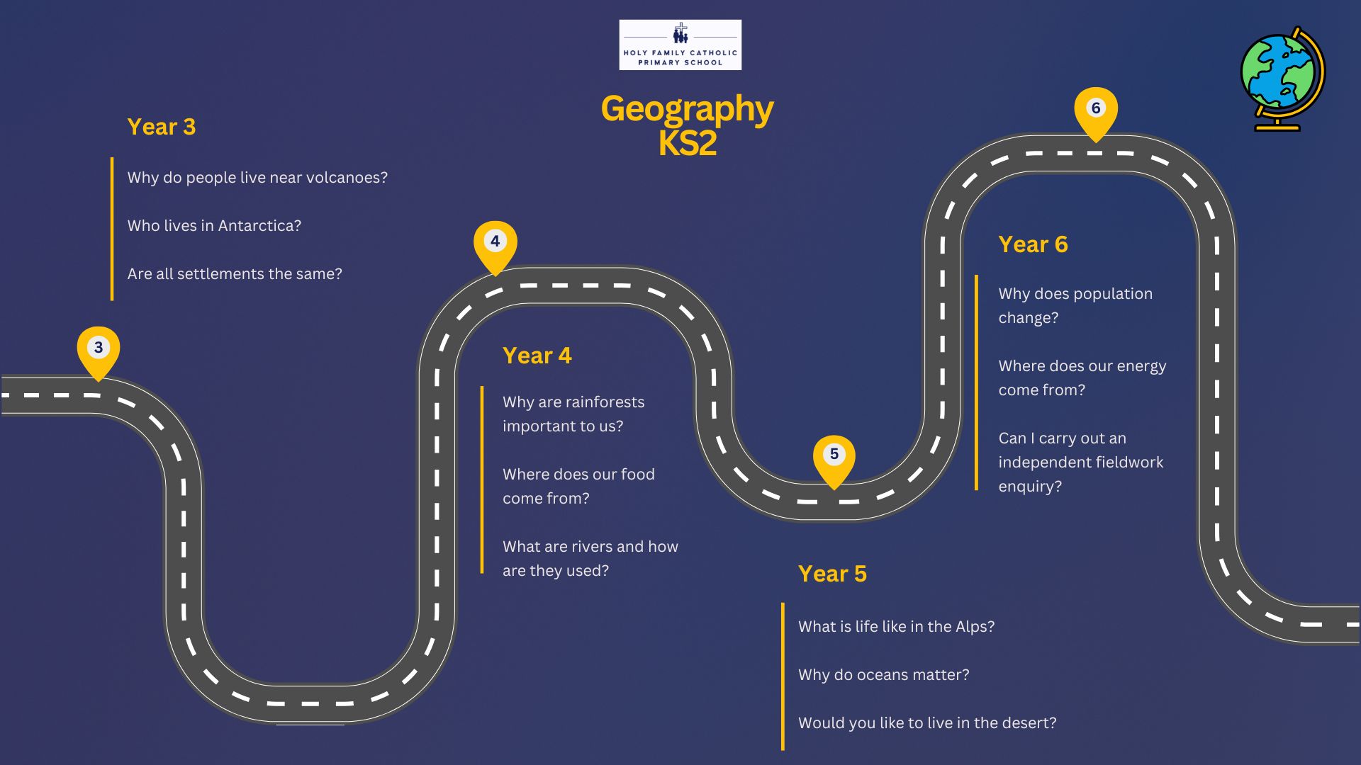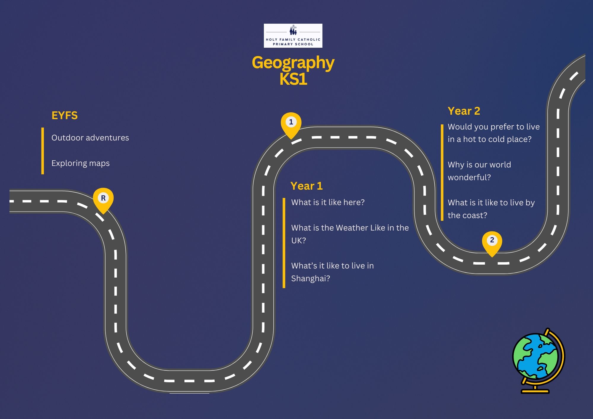 At Holy Family School, we believe that Geography helps our children appreciate the beauty, diversity, and wonder of God’s creation. Through our Geography curriculum, supported by the Kapow Primary scheme, we aim to inspire pupils to explore and understand the world around them as stewards of the Earth, recognising our shared responsibility to care for our common home.