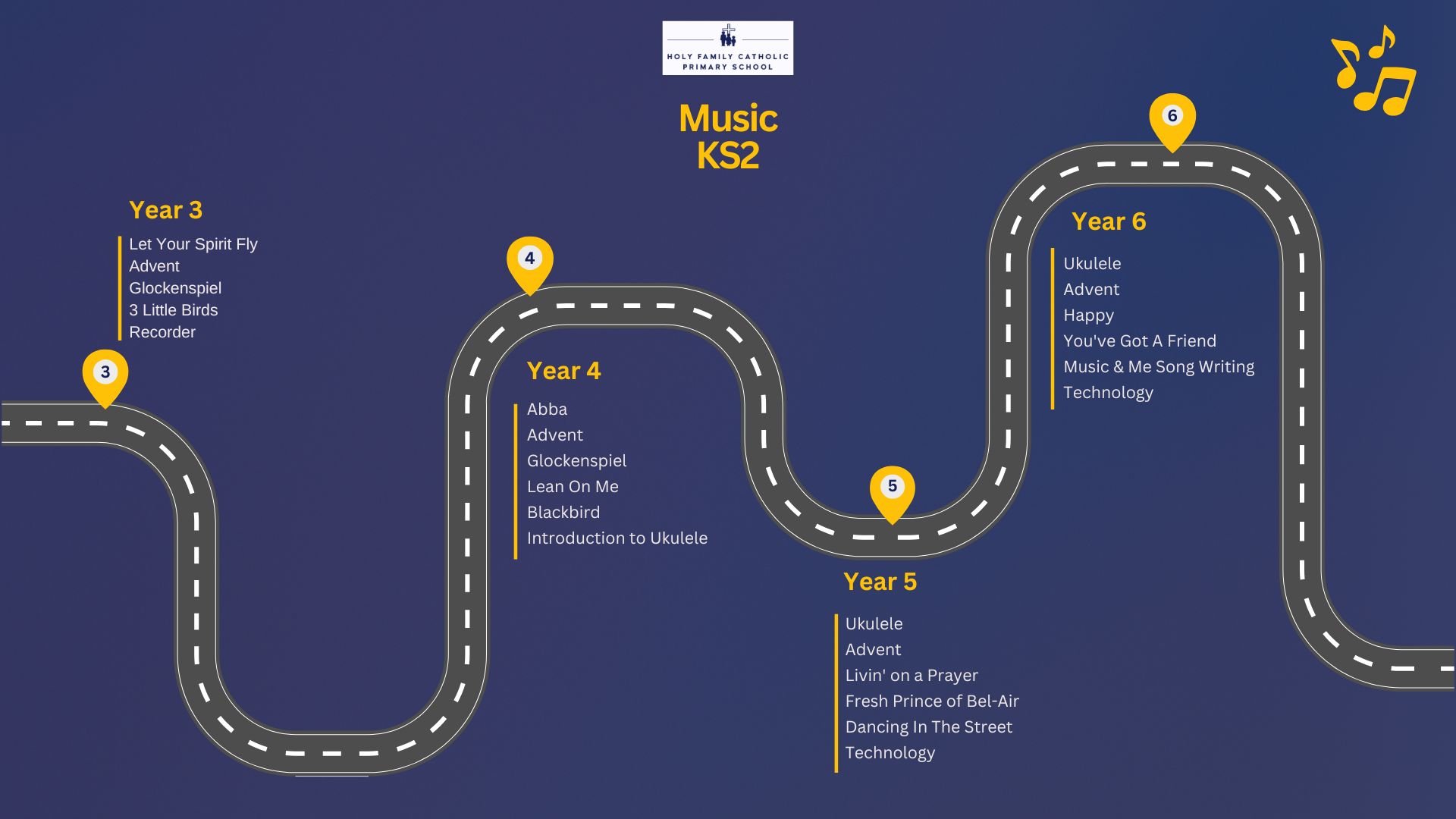 At Holy Family, music is a vibrant and integral part of our curriculum, ensuring that every child from Year 1 to Year 6 receives engaging and enriching musical education. Taught by our specialist teacher, Mrs Hunter, our music lessons promote essential motor skills, communication, creativity, and teamwork, all while fostering a lifelong love of music.