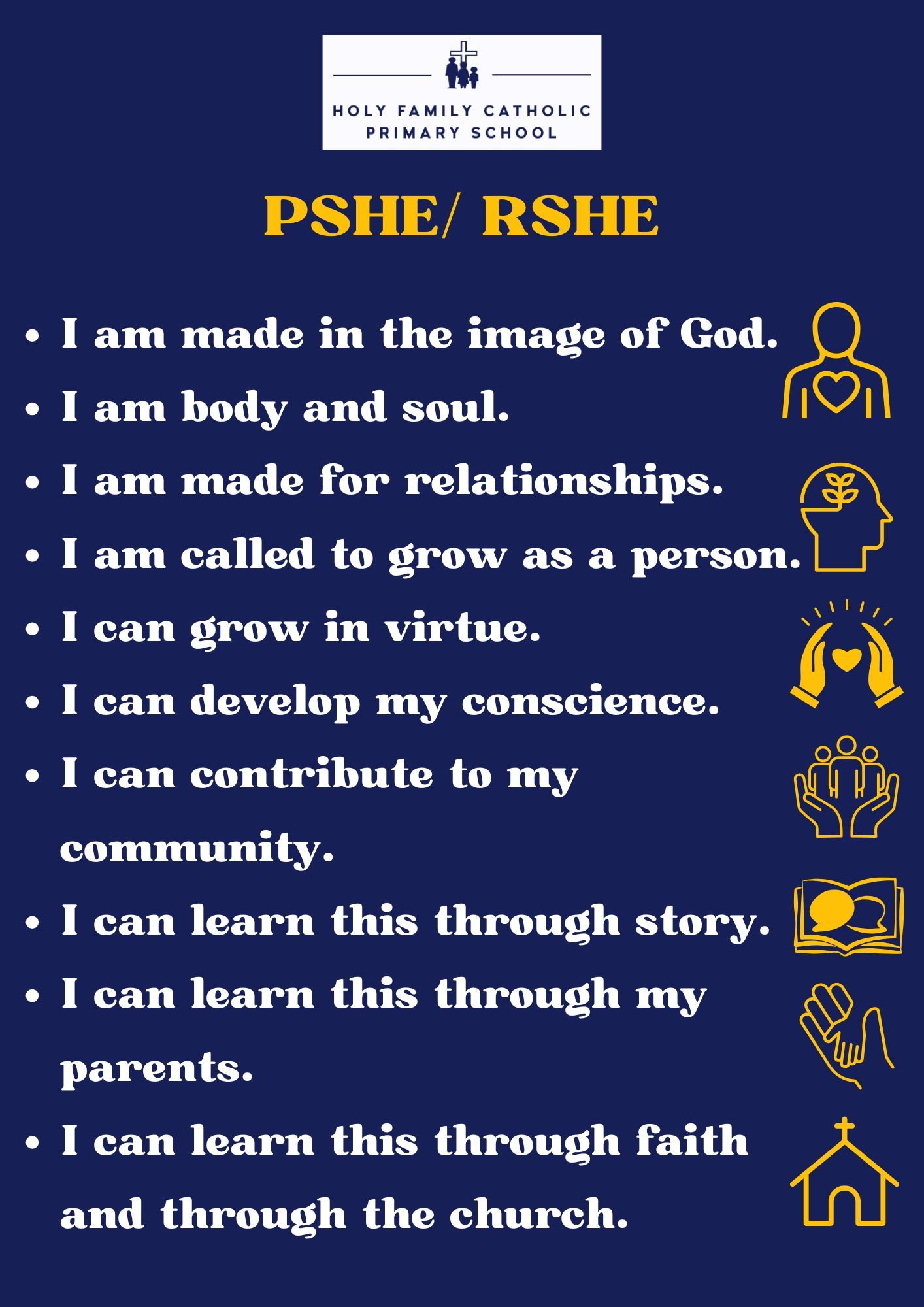 At the Holy Family, our PSHE curriculum aims to prepare each child for their life in the wider world, now and in the future. We look to develop the child as a whole person, supporting them in developing the knowledge, skills and values they need to make informed decisions, overcome challenges and keep themselves safe. The Department for Education refers to PSHE as, 'an important and necessary part of all pupil's education', one that we believe is vital to help them to develop socially, mentally and physically.