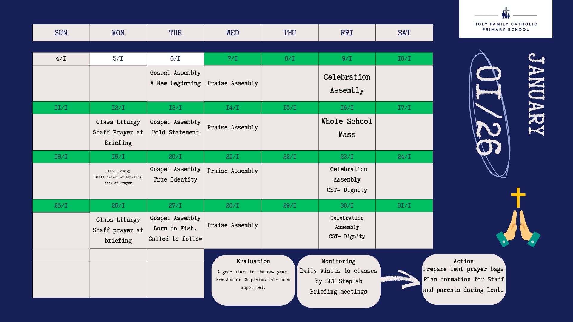 Holy Family's Annual Plan of Provision (APoP) is a year-long strategy that outlines how we will bring our Catholic life and mission to life through various activities, including Religious Education (RE), prayer, liturgy, school Masses, retreats, and sacramental preparation. It ensures that our Catholic ethos is integrated into all aspects of our daily life and is tailored to the spiritual needs of all our children.